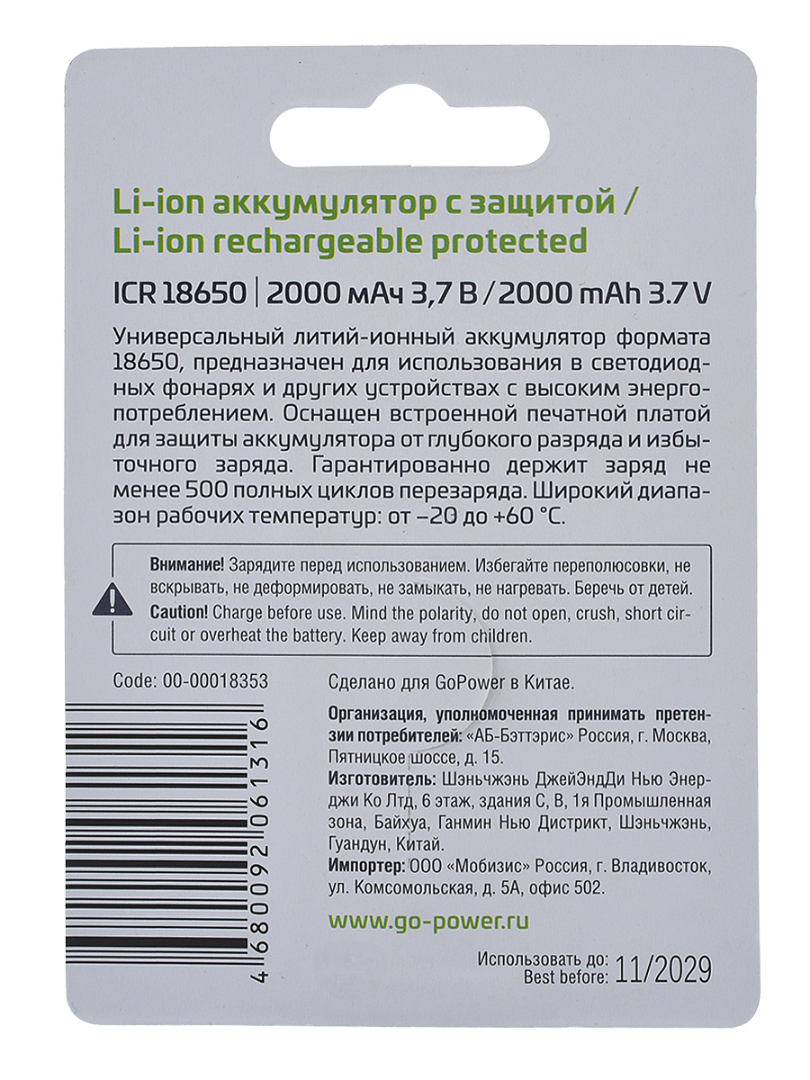 Литий-ионный (Li-ion) аккумулятор GoPower размера 18650. Зарядите перед использованием.
