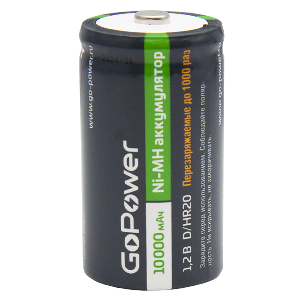 Ni-MH аккумулятор размера D/НR20 емкостью 10000мАч. Если вы часто покупаете батарейки, переходите на Ni-MH аккумуляторы GoPower! Ni-MH аккумуляторы GoPower перезаряжаемы до 1000 раз и заменят батарейки во всех современных устройствах, они сэкономят деньги и не навредят окружающей среде. Производятся по улучшенной технологии с использованием премиальных компонентов, что гарантирует продолжительный срок службы 1000 циклов и сниженный саморазряд.