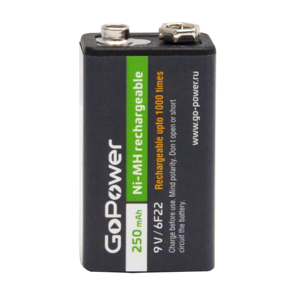 Ni-MH аккумулятор размера 9В Крона емкостью 250мАч. Если вы часто покупаете батарейки, переходите на Ni-MH аккумуляторы GoPower! Ni-MH аккумуляторы GoPower перезаряжаемы до 1000 раз и заменят батарейки во всех современных устройствах, они сэкономят деньги и не навредят окружающей среде. Производятся по улучшенной технологии с использованием премиальных компонентов, что гарантирует продолжительный срок службы 1000 циклов и сниженный саморазряд.