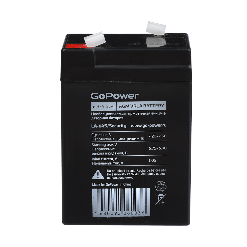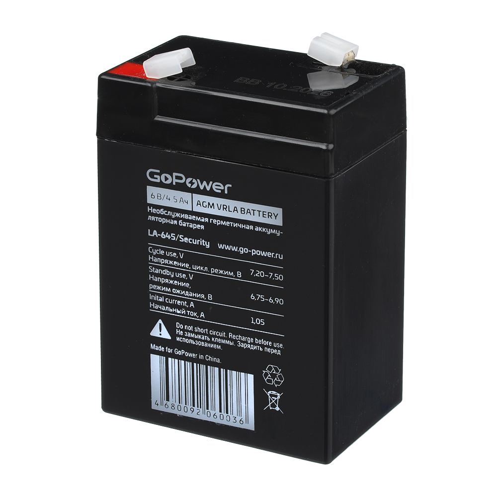 Свинцово-кислотные аккумуляторные батареи GoPower серии security – полностью герметизированные, необслуживаемые, с системой рекомбинации газов (VRLA). Производятся по технологии AGM - электролит абсорбирован в стекловолоконном сепараторе, что обеспечивает абсолютную защищенность от утечки электролита. Материал корпуса и крышки сделан из огнеупорного ABS пластика. Аккумуляторные батареи GoPower отличаются широким диапазоном рабочих температур от - 20°С до +50°С и минимальным саморазрядом – не более 2,5 % в месяц при нормальных условиях. Аккумуляторы серии security соответствуют международным стандартам безопасности и рекомендованы для применения в охранно-пожарных системах, системах контроля и управления доступом, телекоммуникационном оборудовании, детских электромашинах и других областях. Области применения серии security: Охранно-пожарные системы и сигнализации. Системы контроля и управления доступом. Кассовые аппараты и др. ВНИМАНИЕ! Серия security не рекомендована для использования в источниках бесперебойного питания (ИБП, UPS) и высокотоковых схемах!